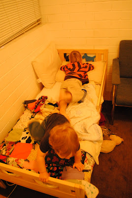 The next morning Eliot and Peter were delighted to discover the bed in the living room and spent the morning playing on it.  We moved it into the boys' bedroom and that night Eliot went to sleep in his big bed like a champ.  He still takes his afternoon nap in the crib (while Peter sleeps in the Pack n Play that's set up in our room) but at night it's all about the big bed.  And of course Peter has had no problem adjusting to the crib.